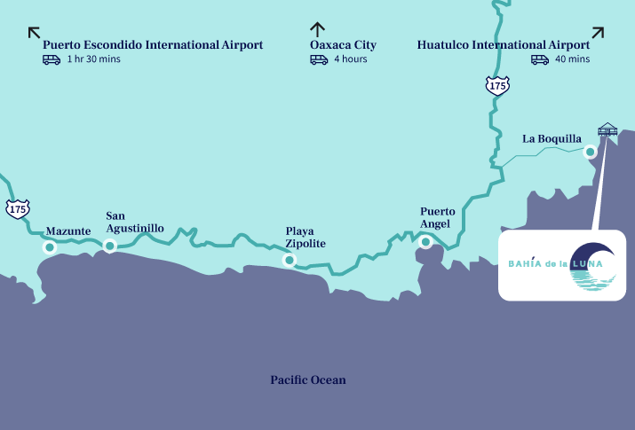An oasis of calm and natural beauty Playa La Boquilla just a 40 min drive from Huatulco international airport and 1 hour 30 minutes drive from Puerto Escondido international airport.